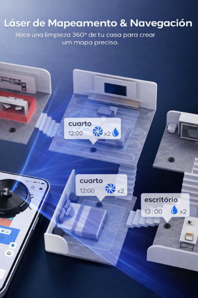 🧭 Navegación ultra inteligente: utiliza mapeo láser con IA de última generación, reconoce y evita objetos en tiempo real y limpia con rutas ordenadas, habitación por habitación, sin bloqueos ni caos.